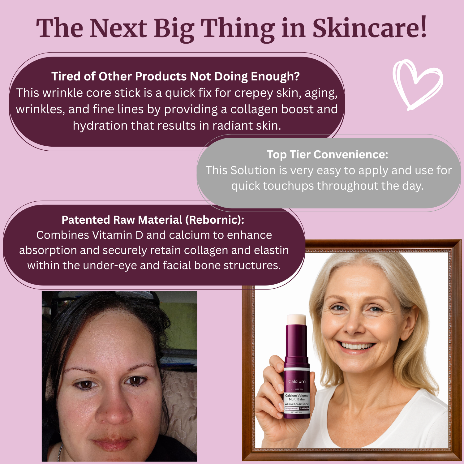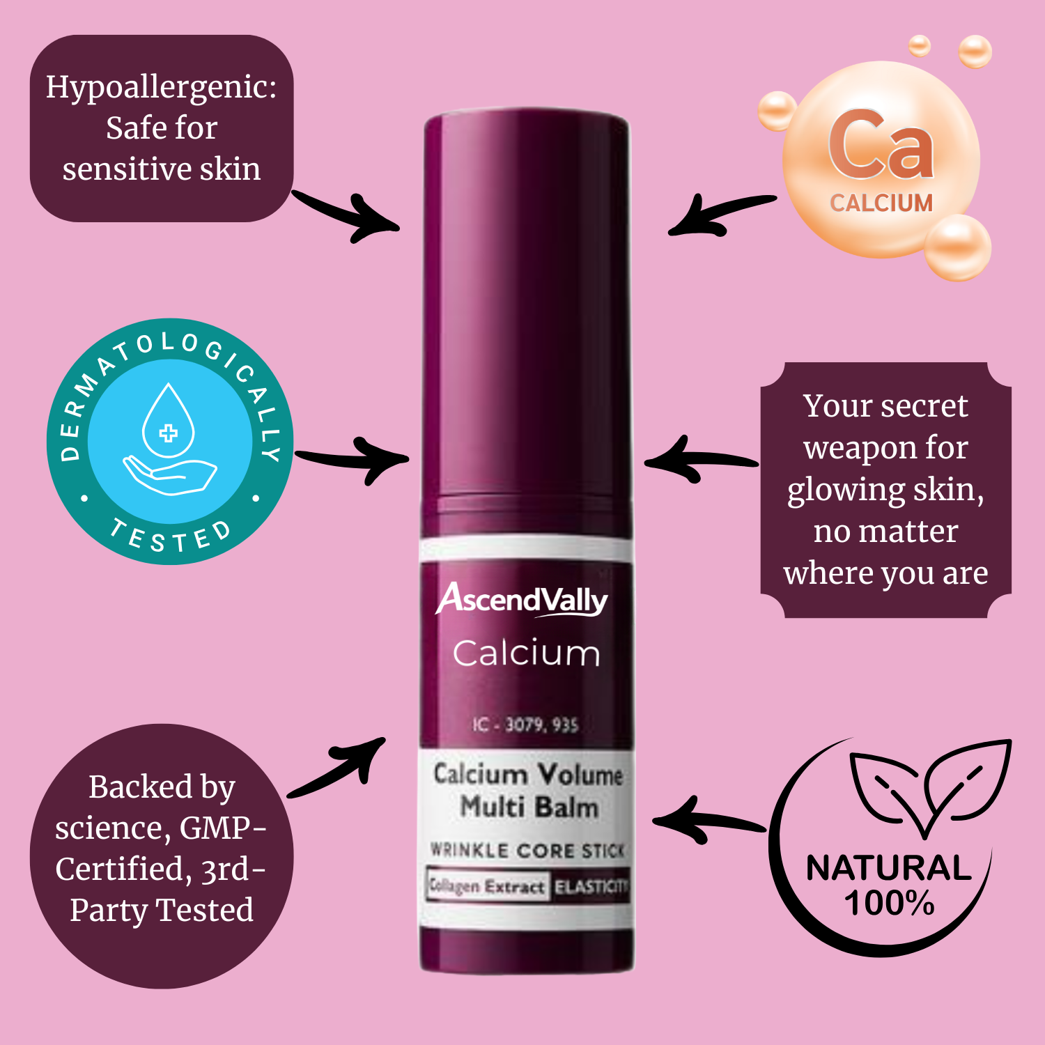 The Ascend Vally Calcium Multi-Balm acts as a complete skin solution, expertly designed to smooth away visible fine lines and wrinkles while targeting specific concerns like smoker lines and tired under-eyes. With every application, this potent formula brightens dark circles, restores firmness, and boosts elasticity, deeply hydrating the skin to leave it feeling plumper, fresher, and more radiant. Our signature lightweight stick format makes it effortless to achieve an Ascend Vally glow at home or on the go, ensuring your skin looks younger, more awake, and naturally rejuvenated throughout the day.